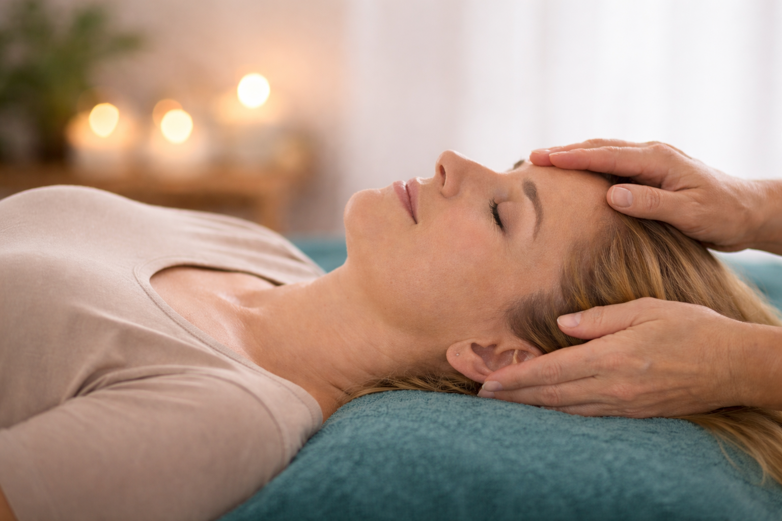 Ik raak de verschillende punten op je hoofd rustig en met aandacht aan. Jij hoeft niets te doen. Veel mensen zakken al snel diep weg in ontspanning, sommigen vallen zelfs in slaap. Alles is goed.
