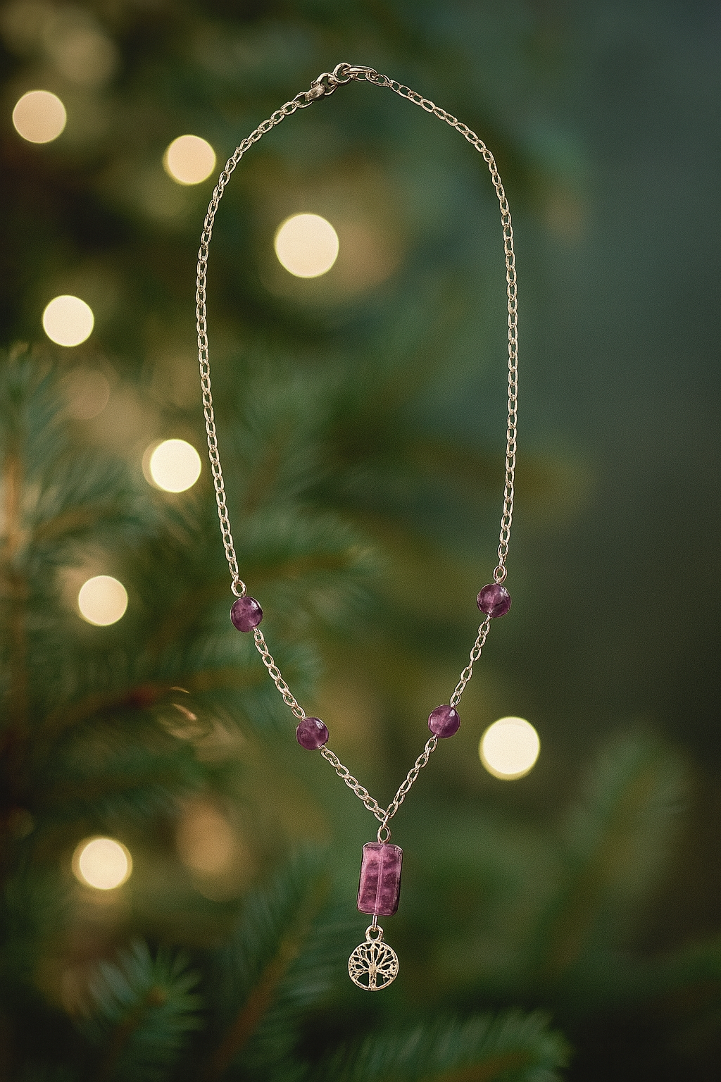 Deze verfijnde stainless-steel ketting is afgewerkt met mooie amethiststenen en een symbool dat staat voor groei en verbondenheid.